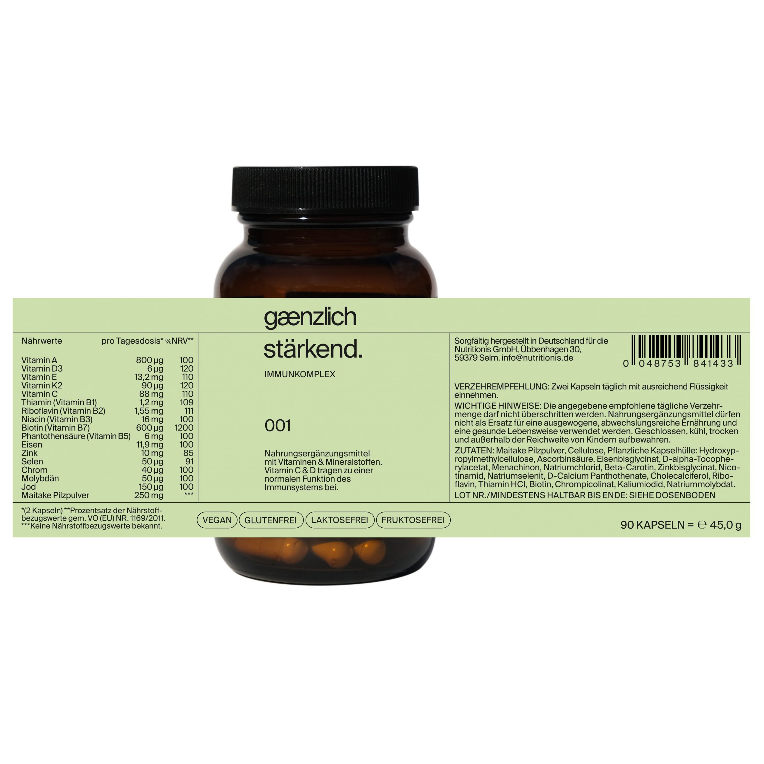Maitake Pilzpulver, Cellulose, Pflanzliche Kapselhülle: Hydroxypropylmethylcellulose, Ascorbinsäure, Eisenbisglycinat, D-alpha-Tocopherylacetat, Menachinon MK7 all trans 0,2% KAPPA, Natriumchlorid, Beta-Carotin, Zinkbigglycynat, Nicotinamid, Natriumselenit, D-Calcium Panthothenate, Cholecalciferol, Riboflavin, Thiamin HCI, Biotin, Chrompicolinat, Kaliumiodid, Natriummolybdat